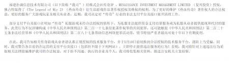 福建撲滿信息技術有限公司注冊地位于福建省福州市,是國內《熱血傳奇》客戶端游戲獨占性版權人。對《熱血傳奇》客戶端游戲擁有全部版權,并有權基于版權權利進行該游戲維權。株式會社傳奇IP (以下簡稱傳奇IP )對《The Legend of Mir 2》(中文名為“熱血傳奇"、或“傳奇”、“傳奇2”、“MIR II”)游戲(以下稱為 “授權作品”) 共同享有充分、完整且有效的著作權。經傳奇IP授權 , RENAISSANCE INVESTMENT MANAGEMENT LIMITED (以下簡稱 RENAISSANCE Ltd.)有權在中國大陸地區獨占性地對授權作品的網絡客戶端游戲進行開發、 發行、管理、宣傳、推廣和運營,針對授權作品的侵權游戲及侵權方,RENAISSANCE Ltd.有權采取必要的措施,并有權將前述權利分授權給第三人。福建撲滿信息技術有限公司經RENAISSANCE Ltd.授權,獲得上述權利,有權在中國大陸地區獨占性地對授權作品的網絡客戶端游戲進行開發、發行、管理、宣傳、推廣和運營,并有權對侵權行為/主體采取維權措施。